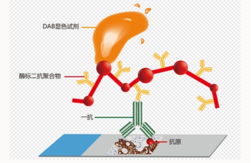免疫組化,全稱是免疫組織化學(xué)(Immunohistochemistry,IHC),是病理診斷中一種重要的輔助檢查技術(shù)手段,主要根據(jù)抗原抗體反應(yīng)和化學(xué)顯色原理,組織切片中的抗原先和一抗結(jié)合,再利用一抗與標(biāo)記生物素、熒光素等二抗聚合物進(jìn)行反應(yīng),再用標(biāo)記辣根過氧化物酶(HRP)或堿性磷酸酶(AKP)等的抗生物素(如鏈霉親和素等)與酶標(biāo)二抗聚合物結(jié)合,最后通過呈色反應(yīng)或熒光來顯示細(xì)胞或組織中化學(xué)成分,在顯微鏡下可清晰看見組織細(xì)胞內(nèi)發(fā)生的抗原抗體反應(yīng)產(chǎn)物,從而能夠在組織切片上原位確定某些化學(xué)成分的分布和含量[2]。