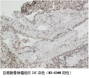 H3G34(H3.3 G34)又稱H3F3A G34W。位于第1號染色體上的H3F3A基因G34位點發(fā)生突變,突變形式不同分為G34W/R/V/L等(突變包括甘氨酸 34 被色氨酸(G34W)、精氨酸(G34R)或纈氨酸(G34V)替換),其中G34W為常見。骨巨細(xì)胞瘤(GCTB)出現(xiàn) H3G34W 突變的頻率較高(>90%),而 H3G34R/V 突變則主要出現(xiàn)在兒童及青少年高級別膠質(zhì)瘤中。膠質(zhì)瘤中,H3.3G34R/V 突變與腫瘤抑制基因p53和 ATP 依賴型解旋酶ATRX 的功能缺失性突變以及 N-Myc 蛋白的表達(dá)失調(diào)有關(guān)。
