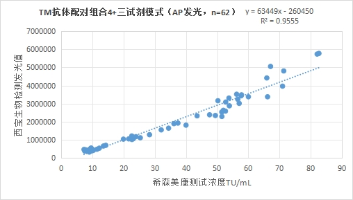 西寶生物發(fā)光(AP)平臺(tái)TM抗體配對(duì)組合4(三試劑模式)與希森美康 TM試劑(化學(xué)發(fā)光法)賦值的臨床樣本相關(guān)性R2>0.95,相關(guān)性良好。