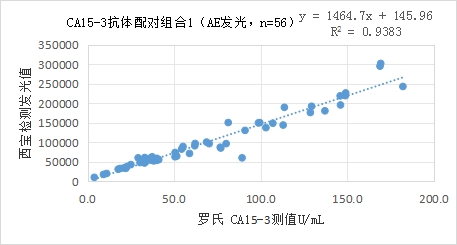 西寶CA15-3抗體配對組合1(兩試劑模式)的測試臨床樣本與羅氏CA15-3試劑賦值的臨床樣本(相關(guān)性R2在0.93左右,相關(guān)性較好;