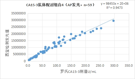 西寶CA15-3抗體配對組合4(三試劑模式)的測試臨床樣本與羅氏 CA15-3試劑賦值的臨床樣本相關(guān)性R2在0.94左右,相關(guān)性較好;
