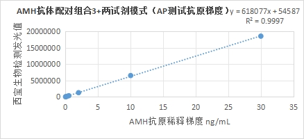 3.2.1西寶生物發(fā)光(AP)平臺(tái)AMH抗體配對(duì)組合3與羅氏診斷的AMH試劑(電化學(xué)發(fā)光法)賦值的臨床樣本相關(guān)性R2>0.95左右,相關(guān)性較好;