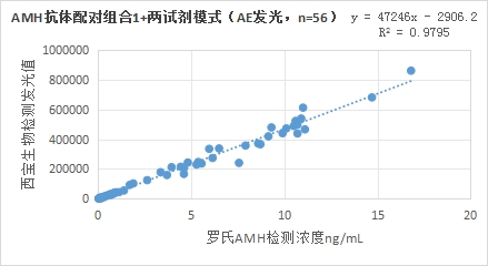 西寶生物熒光平臺(tái)AMH抗體配對(duì)組合5與羅氏診斷的AMH試劑(電化學(xué)發(fā)光法)賦值的臨床樣本相關(guān)性R2>0.95左右,相關(guān)性良好。
